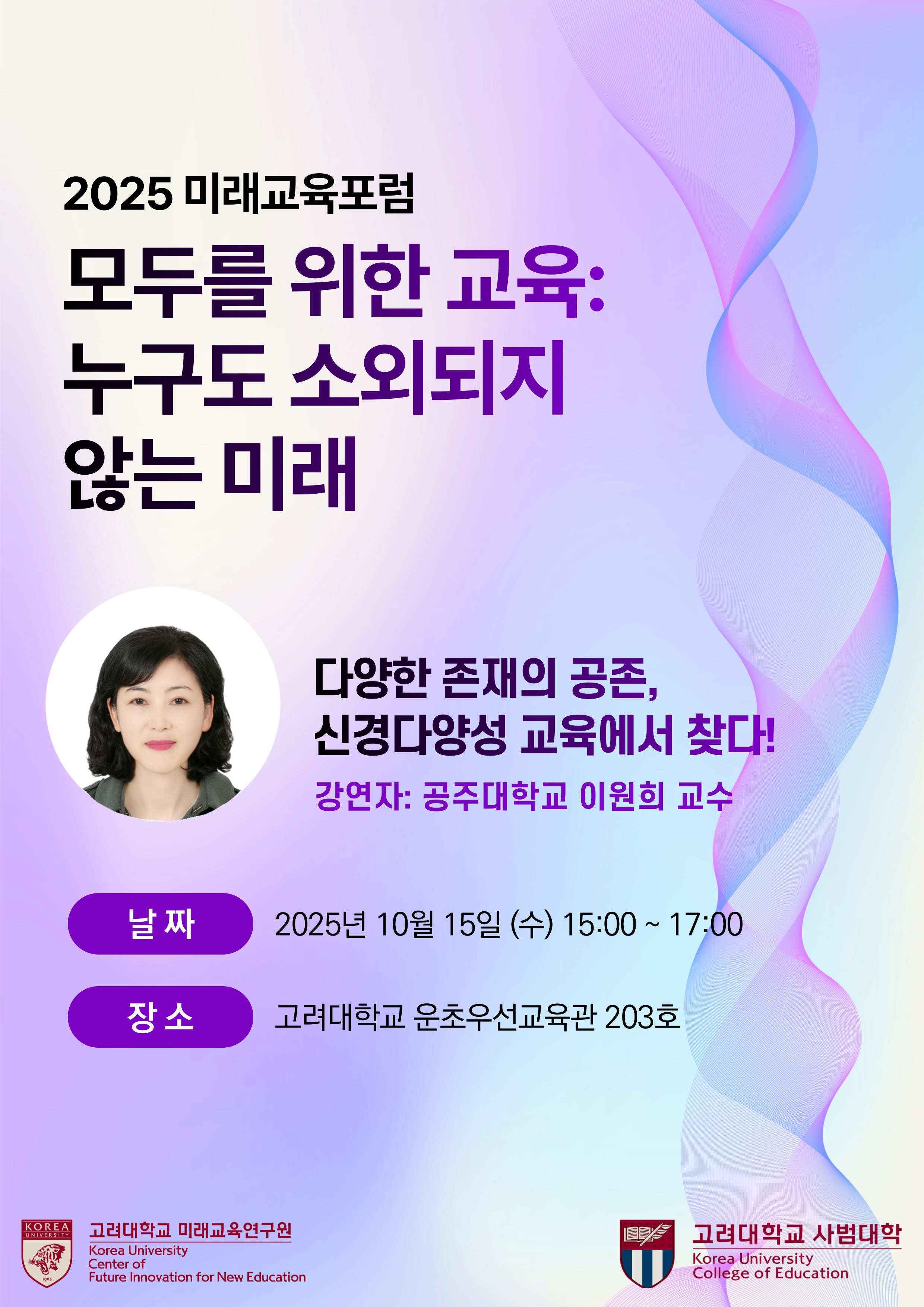 2025-2학기에는 '다양한 존재의 공존'과 '미래 교육을 위한 교수법'이라는 두 가지 핵심 주제를 다룹니다. 급변하는 교육 현장에서 소외되는 학생 없이 모두가 함께 성장할 수 있는 방안을 함께 모색하는 자리에 여러분을 초대합니다.